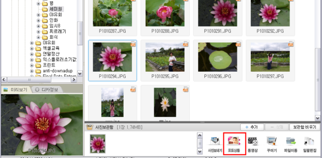 1. 알씨 실행하신 후 왼쪽 탐색기 메뉴에서 사진이 있는 폴더로 이동 후 주문할 사진을 선택하여 마우스 드래그 또는 [+ 추가]버튼을 눌러 사진보관함에 넣고, 오른쪽의 [포토상품] 버튼 클릭합니다.