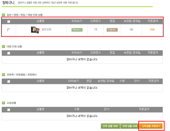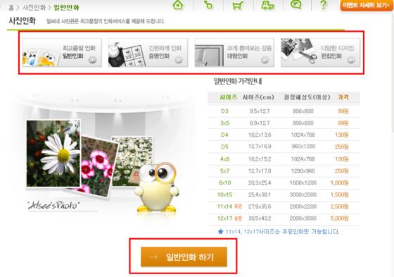 인화상품 중 원하시는 상품을 선택하실 수 있으며, 일반인화 선택시 [일반인화 하기] 버튼을 클릭합니다.