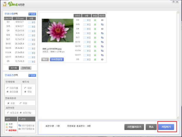 3. 사이즈 및 수량, 인화옵션등을 지정하여 [저장하기]를 누릅니다.