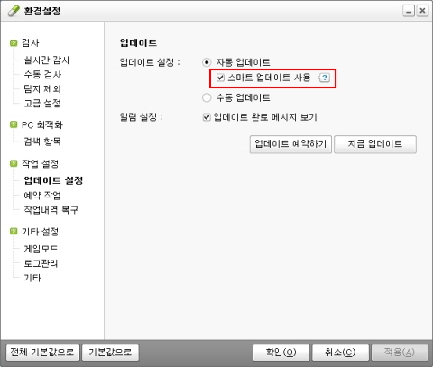 ■ 설정 방법 스마트 업데이트 방식 사용 여부를 사용자 분들이 직접 결정할 수 있도록 알약 환경설정 작업설정>업데이트 설정에 '스마트 업데이트 사용’ 옵션을 마련해 두었습니다. 기존의 서버 기반 업데이트 방식을 선호하는 분들은 위 옵션의 체크를 해제하신 후 사용하시면 됩니다.