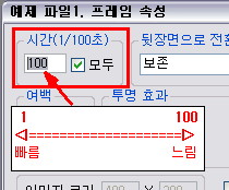3. 좌측 상단의 "시간(1/100초)" 항목 옆의 입력란에 적절한 숫자 입력합니다. 시간은 1/100초 단위로, 1을 입력하면 프레임이 0.01초만 보이고 다음 프레임으로 바뀝니다. 만약 300을 입력하면 3초 동안 표시됩니다. 숫자가 클수록 프레임 전환 속도가 느립니다.