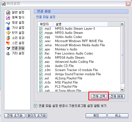 알송에서 F4키를 누르거나 [도구]-[환경설정]을 선택합니다. [연결파일]탭을 열어 "전체선택"을 누르고, 확인 버튼을 누르면 적용됩니다.