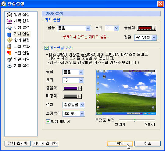 데스크탑 가사창은 Windows 2000, XP 이상 환경에서만 이용할 수 있는 기능입니다. ( windows98/ Me 에서는 운영체제 특성 때문에 지원하지 않습니다.)