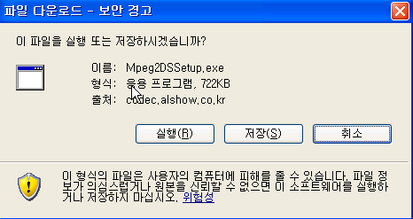 실행을 누르면 다운로드 완료 시점에 바로 코덱설치창이 나타나며, 저장을 누르면 지정한 위치에 설치 파일이 저장되므로 더블클릭해야 설치할 수 있습니다.