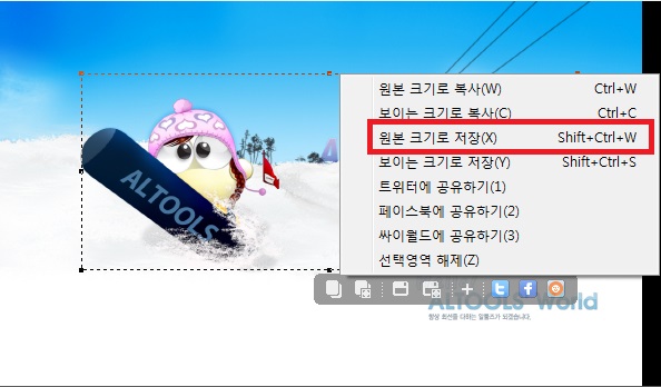 3. 마우스 오른쪽 버튼을 누른 후 [원본 크기로 저장]을 클릭하거나 Shift+Ctrl+W를 입력합니다. (이전 버전에서는 [도구]-[선택영역저장]) 파일 이름과 형식을 지정한 후 원하는 경로에 저장합니다.
