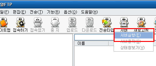 1. 알FTP의 도구모음에서 [서버] - [서버실행]을 선택합니다.