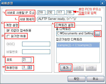 ㅅ. "디렉토리 지정" 접속을 허용할 홈 디렉토리(주 경로)를 지정하고 "추가"버튼을 눌러 다른 디렉토리(경로)도 추가로 지정할 수 있습니다.