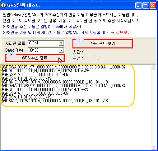 3. "자동포트 찾기"버튼을 클릭합니다. 자동포트를 찾지 못할 경우 연결한 포트와 속도를 직접 입력합니다. GPS 수신속도는 해당 GPS메뉴얼을 참고하거나 제조사에 문의합니다.